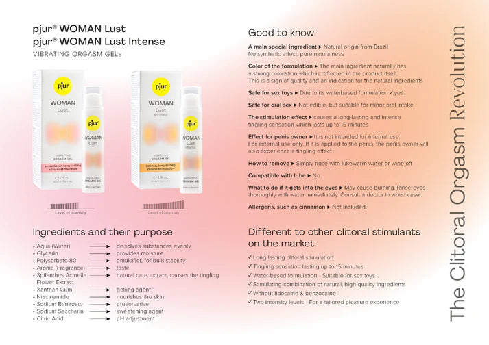 💋 Intense clitoral pleasure in every drop! Woman Lust Intense is a water-based stimulating gel designed to heighten sensation and add a tantalizing buzz to your most sensitive areas. Perfect for use with toys, foreplay, or oral sex, this premium formula delivers up to 15 minutes of thrilling, tingling pleasure.